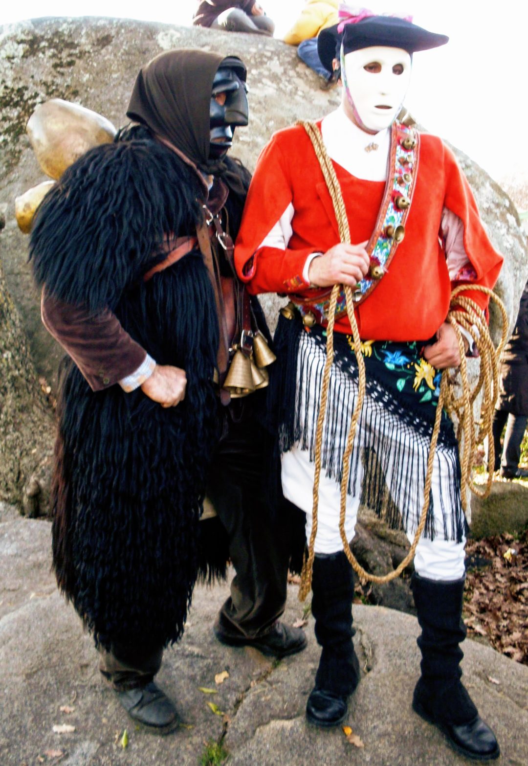 These strange figures wreak havoc in the idyllic village of Mamoiada. The Mamuthones wear black, wood-carved masks that only vaguely resemble human faces. They wrap themselves in black, shaggy skins and carry bells of various sizes on their backs, suspended from crossed leather straps, which can weigh between 20 and 30 kg. These visually and acoustically impressive monsters are accompanied by the Issohadores, who wear white masks and colourful traditional clothing. They use their ropes to catch the Mamuthones, but spectators, especially female ones, should also beware of them!