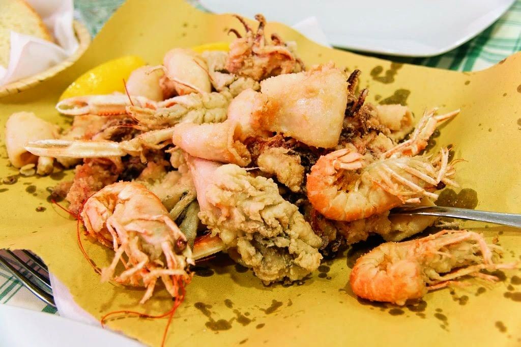 But the biggest sensation at the Mercato di Benedetto is located in the basement. Here, 75 stalls offer exclusively fish, covering the same area as the upper floor. And what fish! Mullet, red mullet, bream, sea bass, oysters from Ogliastra, the famous mussels from Olbia and Oristano, trout from the south and salmon from the north of the island. And, of course, there is also the famous Sardinian speciality bottarga (I mentioned it here), the salted and dried roe of the mullet, which transforms simple pasta into an incomparable delicacy. Lucky are those who have rented a holiday apartment and can stock up on ingredients for a sumptuous dinner at the market – at incredibly low prices, by the way! But whether you're staying in a house or a hotel, after a tour of this fish paradise, everyone is sure to have worked up an appetite. How fortunate that for some time now there have been a few stalls selling delicious fritto misto – mixed fried seafood – to eat on the go. And once you've tasted this delicacy, Germania and its supermarkets will be a distant memory.