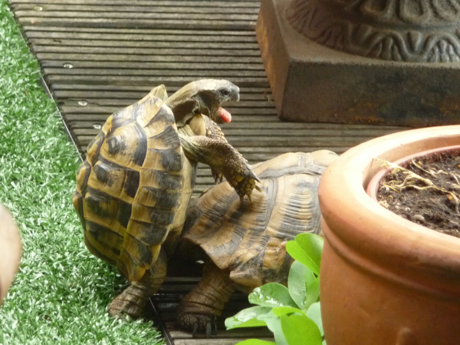 The timing was good, because I had to return to Germany the next day. When I came back to Sardinia months later, I no longer had the two tortoises ‘on my radar’. So I was all the more surprised when, a few days later, I was woken from my sleep by characteristic loud noises. ‘Wild boars,’ I thought, ‘they're digging up my garden!’ I armed myself with a club to scare away the intruders. When I opened the door and stepped outside, to my surprise, there was no sign of any pigs. Instead, there were two Sardinian tortoises loudly engaged in an adult activity. May tortoises! They had returned home a second time, against all odds!